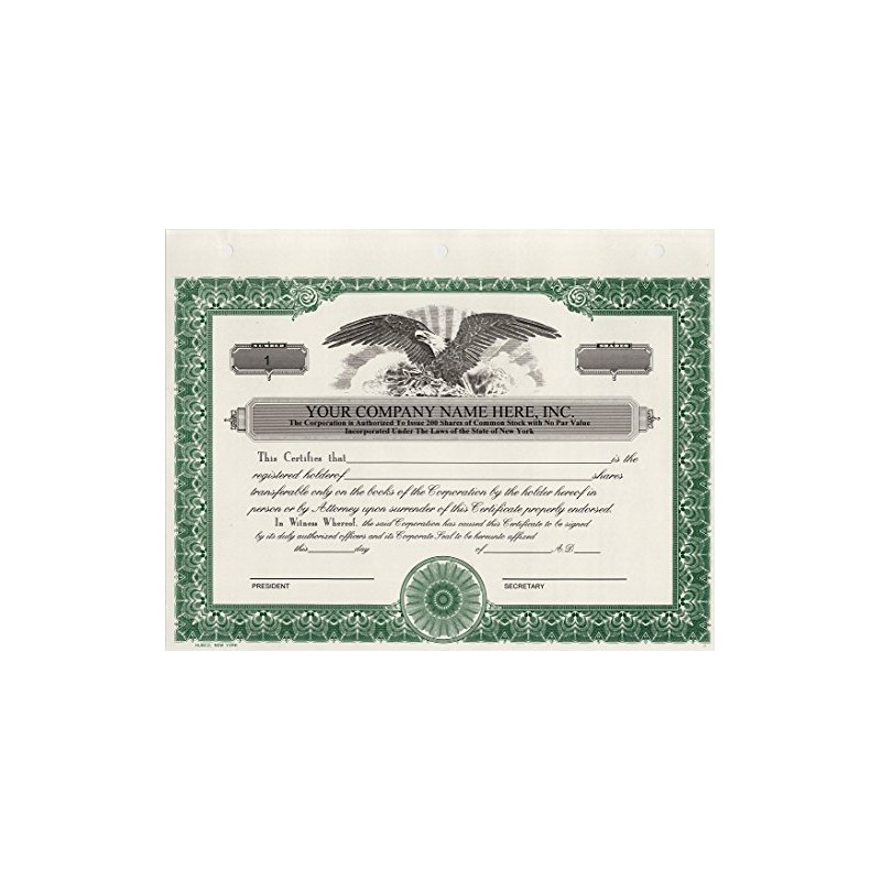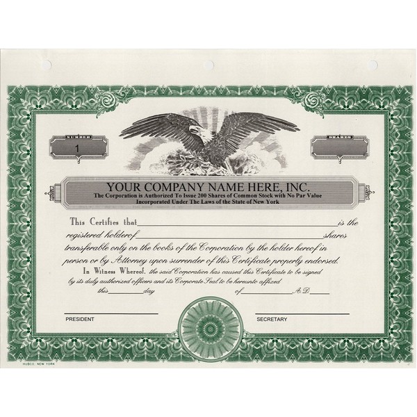 Custom Printed Corporate Stock Certificates, HUBCO, Green, 20-Pack