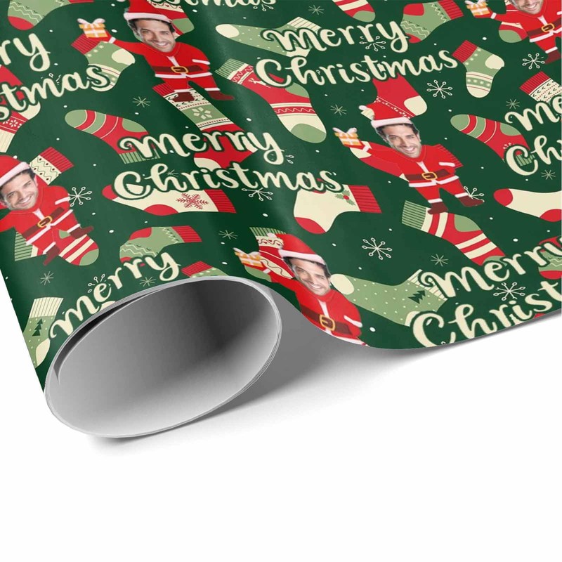 Custom Wrapping Paper Face for Christmas Personalized Christmas Socks Green Text Wrap Paper for Pets Adults Kids Customized Wrapping Paper for Birthday, Christmas Wrapping Paper 5 Rolls