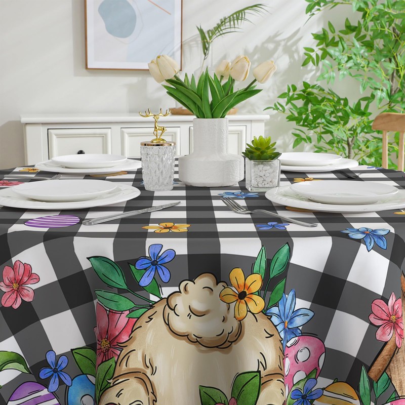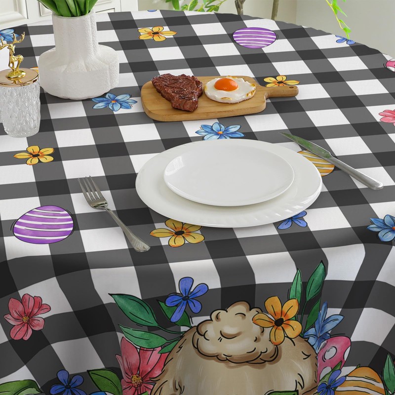 cusugbaso Easter Round Tablecloth 70 inches - Black Plaid Spring Table Cloth Rectangle for Party, Rabbit Decorations for Home