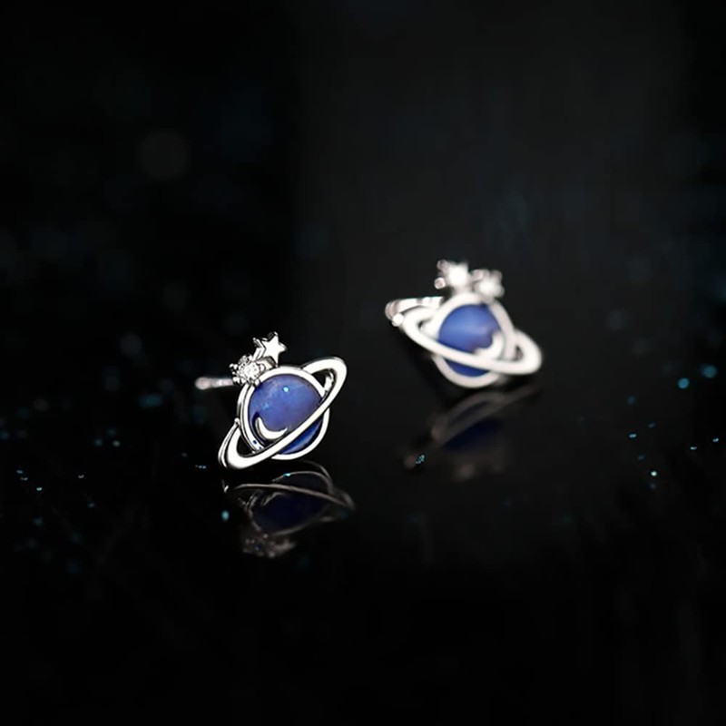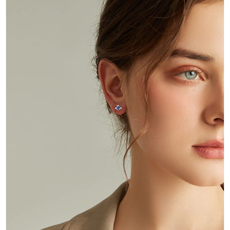 Cute Blue Planets Cartilage Piercing Tiny CZ Stud Earrings 925 Sterling Silver Cubic Zirconia Crystal Lucky Star Tragus Hypoallergenic Sleeper Studs Earring Fashion Jewelry Birthday Gifts for Women