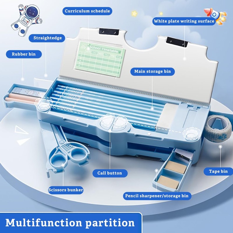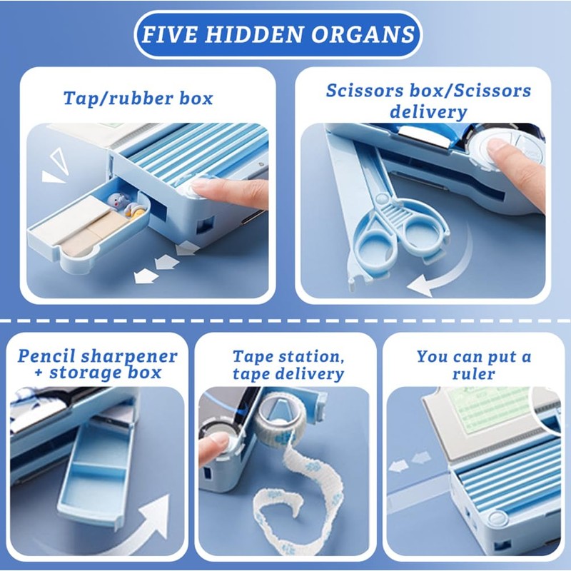 - Multi-Functional Design:The pencil case has several compartments, including eraser compartment, tape compartment, pencil sharpener compartment, scissors compartment, etc. They are all designed with automatic pop-up, just press the button to open, easy and simple to operate.