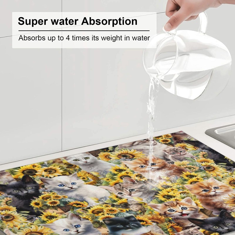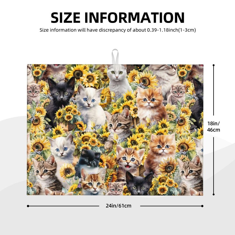 • 【Size & Quick Dry】18x24inch/45.7x60.9cm.Different design on 2 sides, one side can suck moisture with Cute Cat pattern, another one gray non-slip side.Our kitchen drying mat will suck up all the leftover wetness from your pots, pans, and dishes, and leave the underside both dry, easily keep your kitchen countertop dry and tidy.