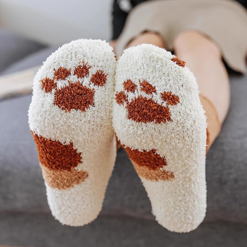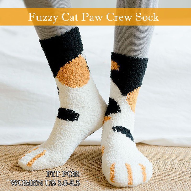 Cute Cat Paw Socks,Fleece Winter Furry Socks Cat Printed Calf Sockfor Women Teens (6 Pairs Cat)