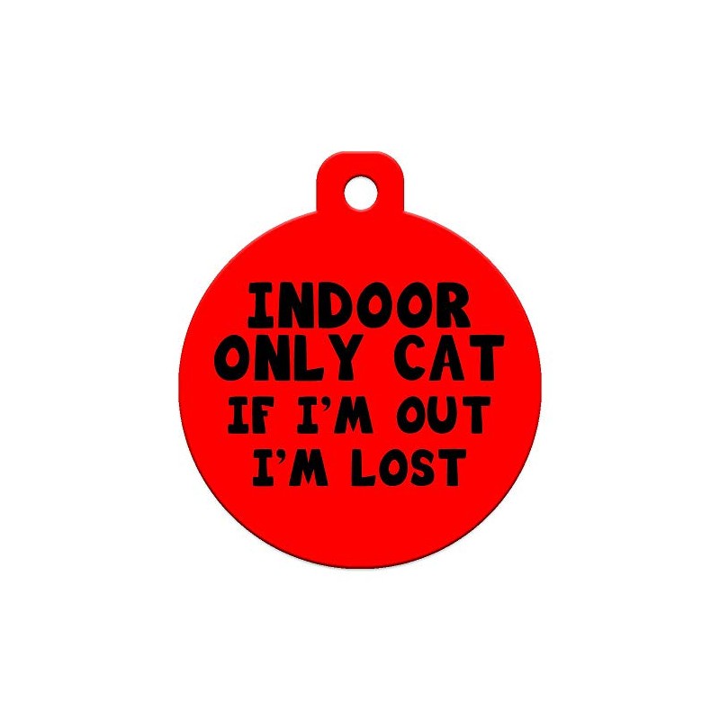 Indoor Only Cat If I'm Out I'm Lost Cat collar charm. The tag is double sided. The "Indoor Only Cat" image is on the front and back of the tag. We also provide a metal split ring to attach to your pet’s collar. Our tags are crafted from durable aluminum and a special process using heat and dyes. The finished product is a beautiful and very durable tag. Need a customized tag? We offer 100's of customizable tags. Click on "Canadian Pet Tags" to view them all.