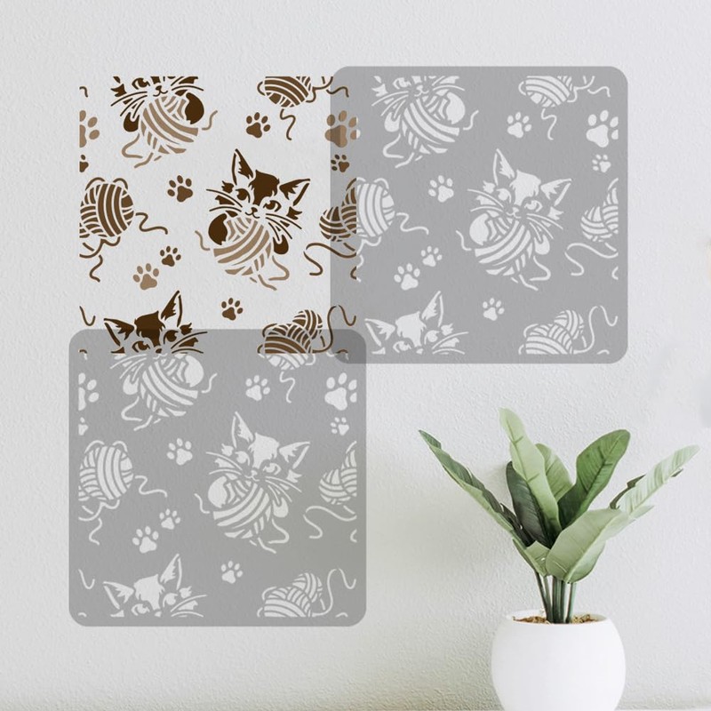 Cute Kitten Allover Stencil for Painting on Wall 30 x 30cm Reusable Plastic Cat Playing with Ball of Wool Craft Stencil for Painting on Wood Fabric