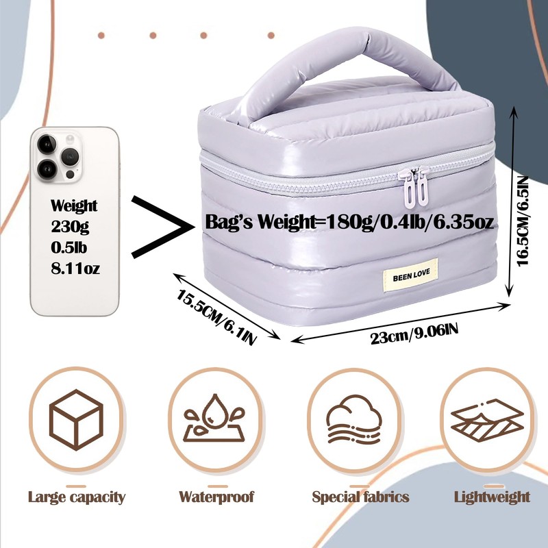 - Down jacket fabric, light and waterproof: This travel cosmetic bag is made of down jacket fabric, which is light and easy to carry, easy to clean, allowing you to quickly put on makeup after daily commuting or fitness, and has excellent Waterproof and shock-absorbing properties, which can protect your cosmetics from moisture and chipping during outdoor activities or camping. Using quilting technology, all stress points are reinforced, making the bag both durable and fashionable.