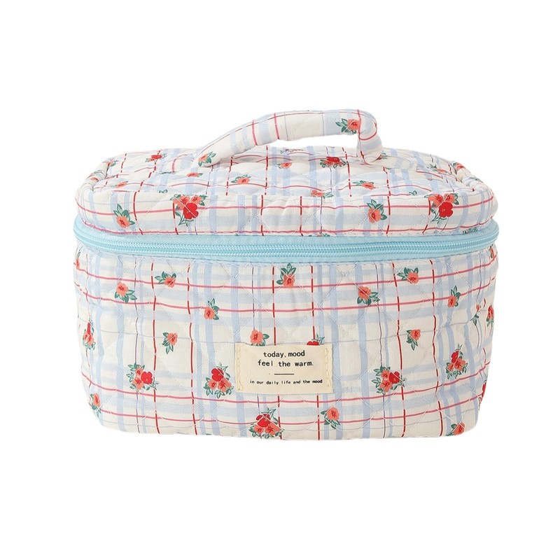 Cute Makeup Bag Cotton Quilted Toiletry Bag Floral Aesthetic Cosmetic Bag Kawaii Puffy Coquette Travel Organizer Pouch Purse for Women (Blue Plaid Flower)
