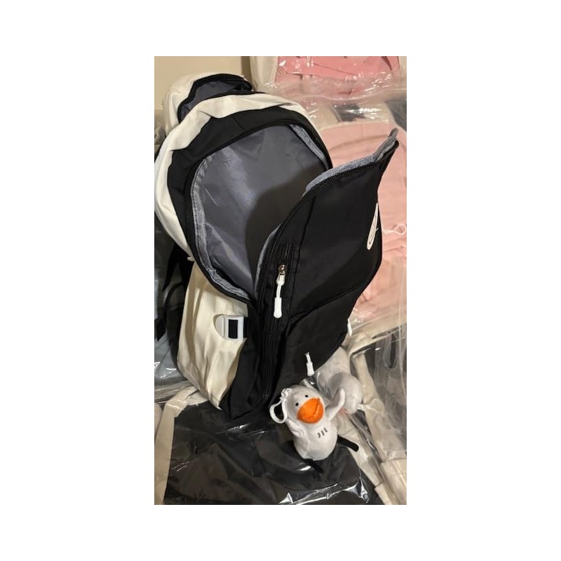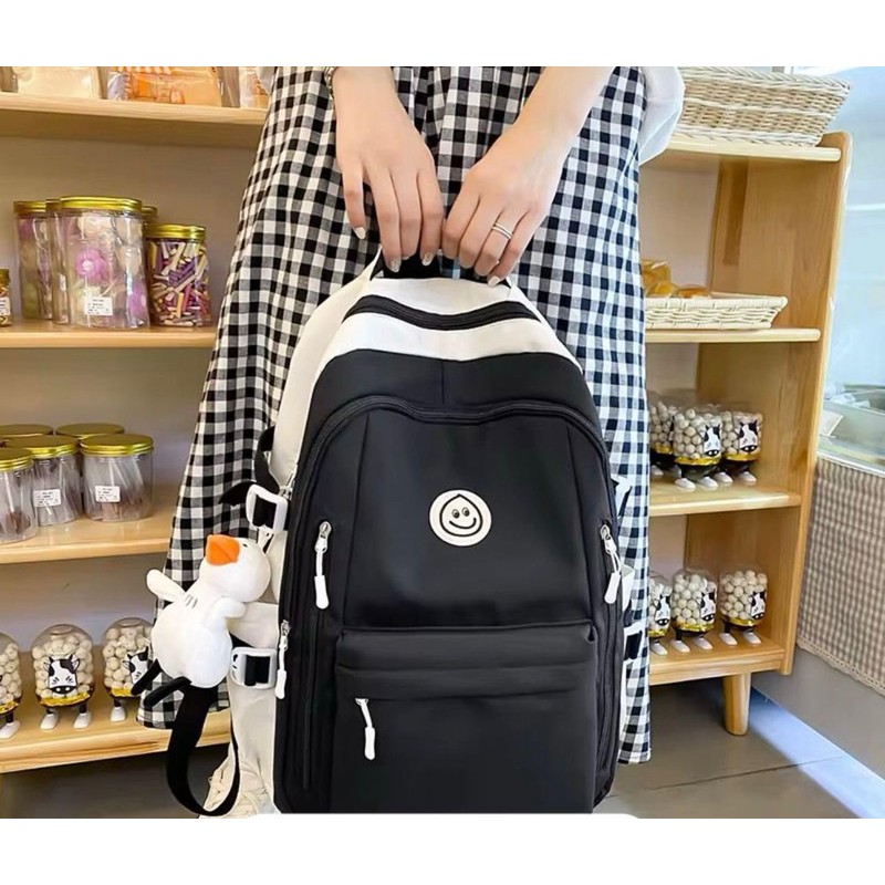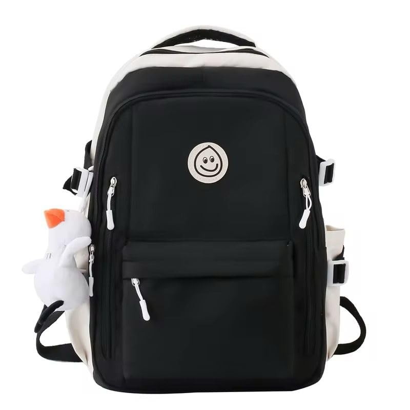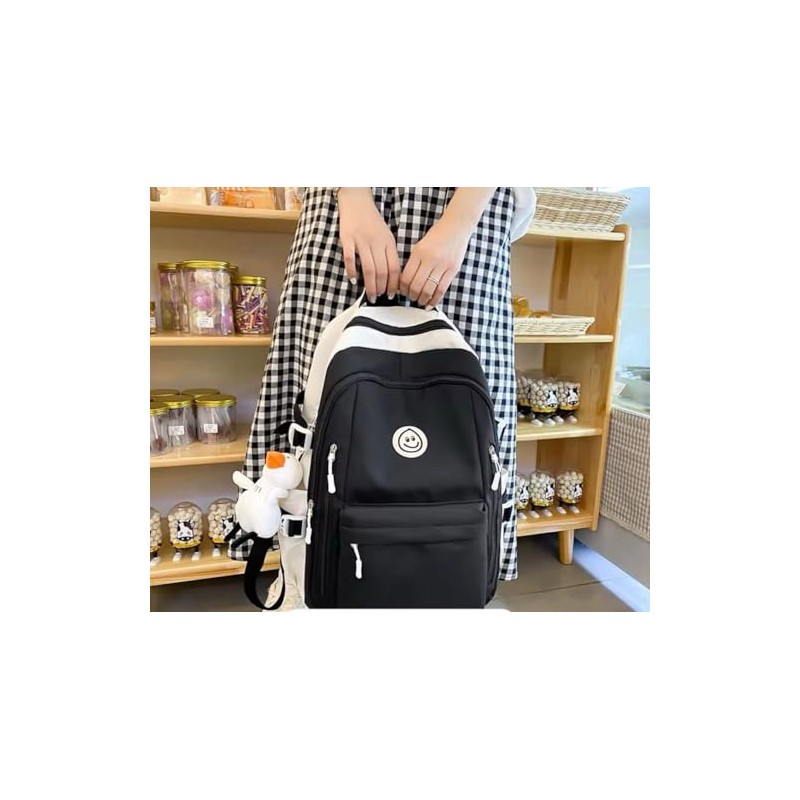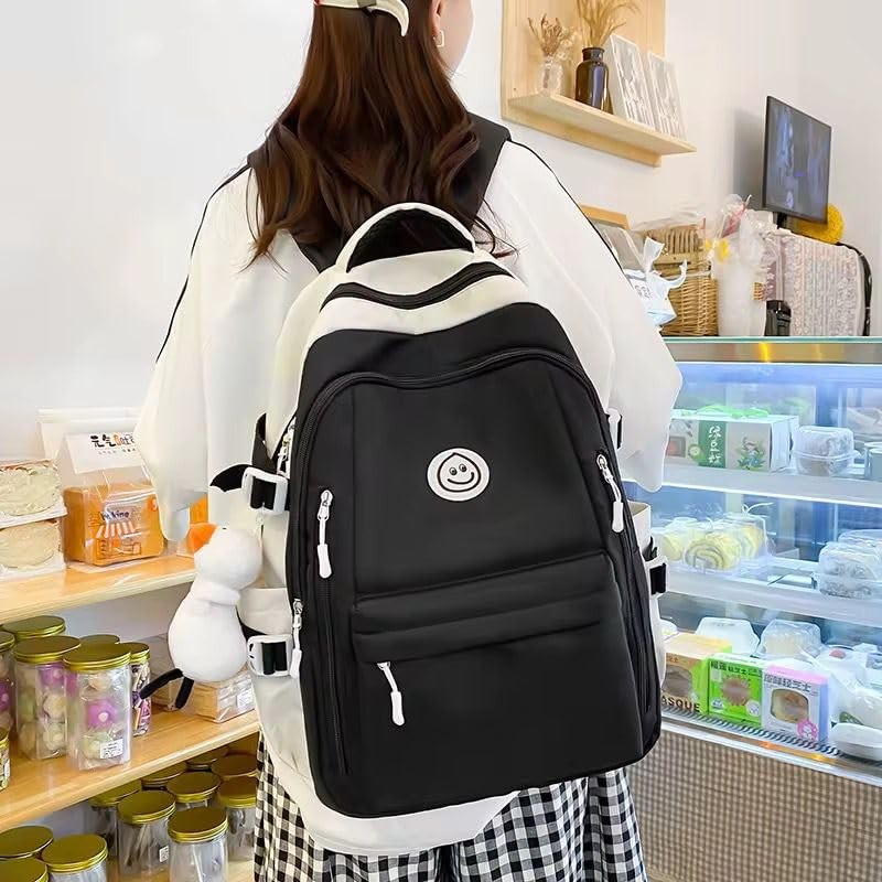 Cute Smiley Face School Backpack, Black and White, Multiple Compartments with Plush Charm
