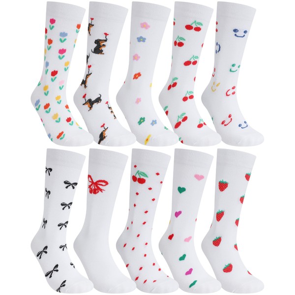 Cutecrop 10 Pairs Floral Socks for Women Novelty Cute Plant Casual Crew Socks for Lady Birthday Holiday Teacher Gift(Cute Style)