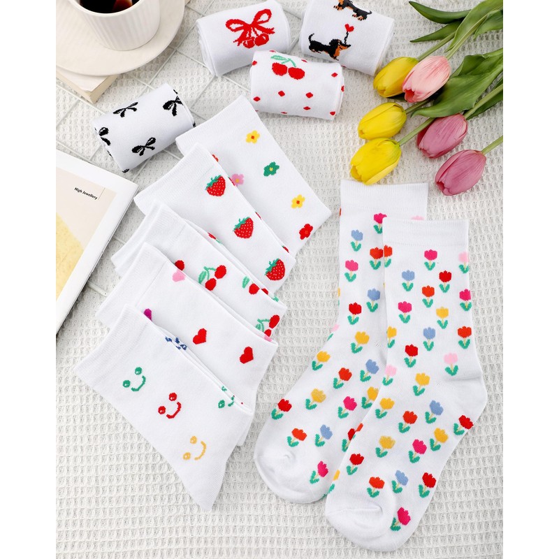 - Simple Pattern: our adult women's mid-tube socks are designed with classic elements such as tulips, hearts, bows, polka dots, smile faces, strawberries, etc., with a solid color background, simple and classic; Suitable for daily matching and casual occasions