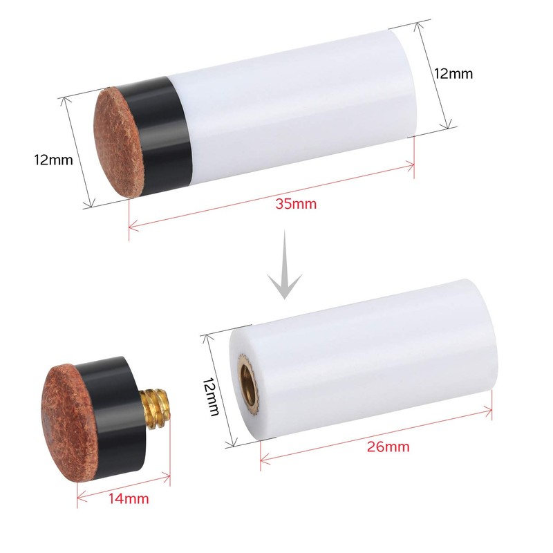 • Standard size: hard brown cue tips and plastic ferrules with 12 mm diameter. Before purchasing, make sure your pool cue has a 12mm diameter ferrule with thread to install the tips.