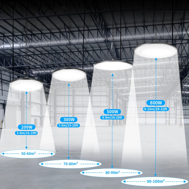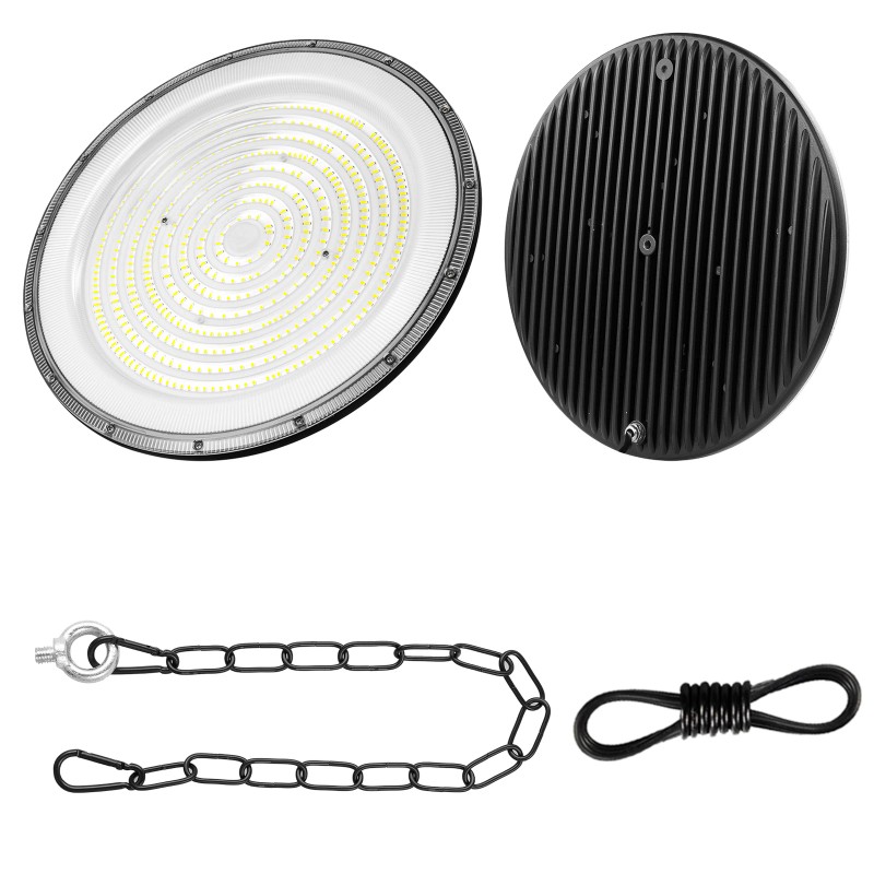 Good heat dissipation performance: UFO has a beautiful appearance, high-pressure cast aluminum shell, and many heat dissipation fins on the lamp shell, which has a good heat dissipation effect, and the PC lens makes the light irradiate the ground more effectively.