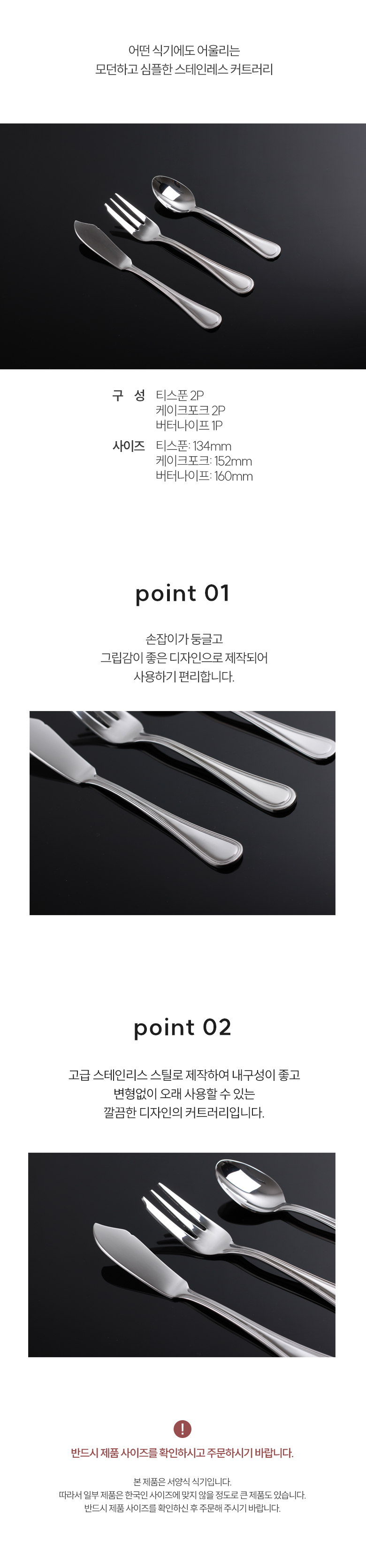 - Components: Butter knife 1P / Cake fork 2P / Teaspoon 2P