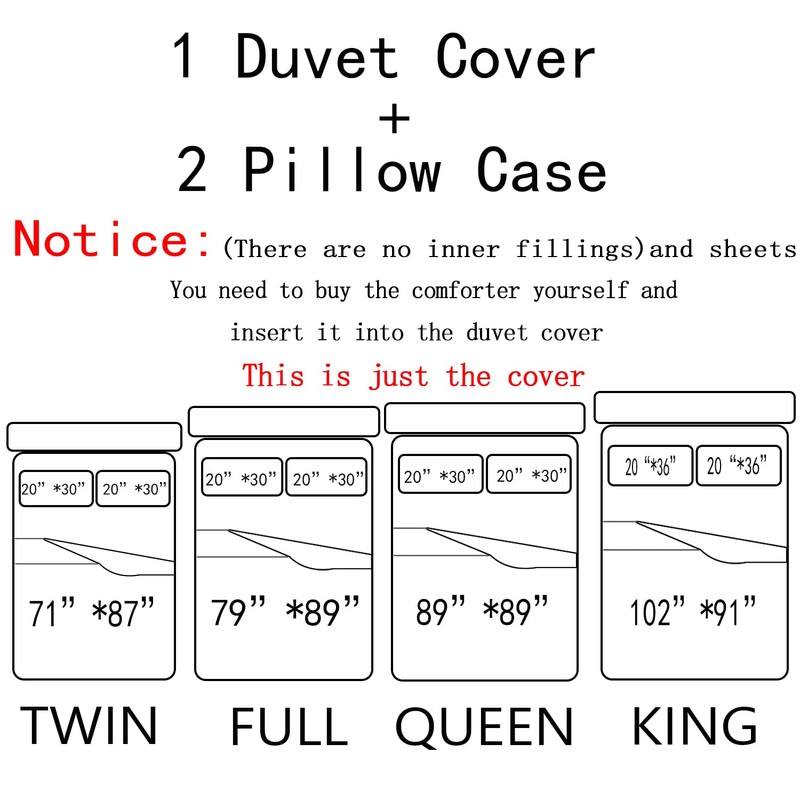 - 😃【Size】This Duvet Cover Set does not Include a Duvet or Comforter, Twin Size (1x Duvet Cover: 71"x89";2x Pillow Sham:20"*30"), Full Size (1xDuvet Cover 79"*89"; 2xPillow Shams 20"*30" ),Queen Size (1xDuvet Cover 89"*89"; 2xPillow Shams 20"*30" ), King Size (1xDuvet Cover 102"*91";2xPillow Shams 20"*36").