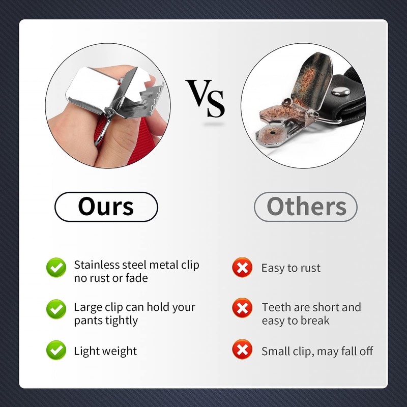 - Stainless steel and Stay fastened: Durable 4 stainless steel metal clips, 2 pcs heavy duty metal adjuster. Never rust, the chrome has not faded at all. Stay fastened, flexible and heavy duty. The clamps have plastic teeth inside for gripping,can hold pants up just fine even when lot's of stuff is in the pants pockets. The clasps are very secure and plastic teeth won't damage your pants.