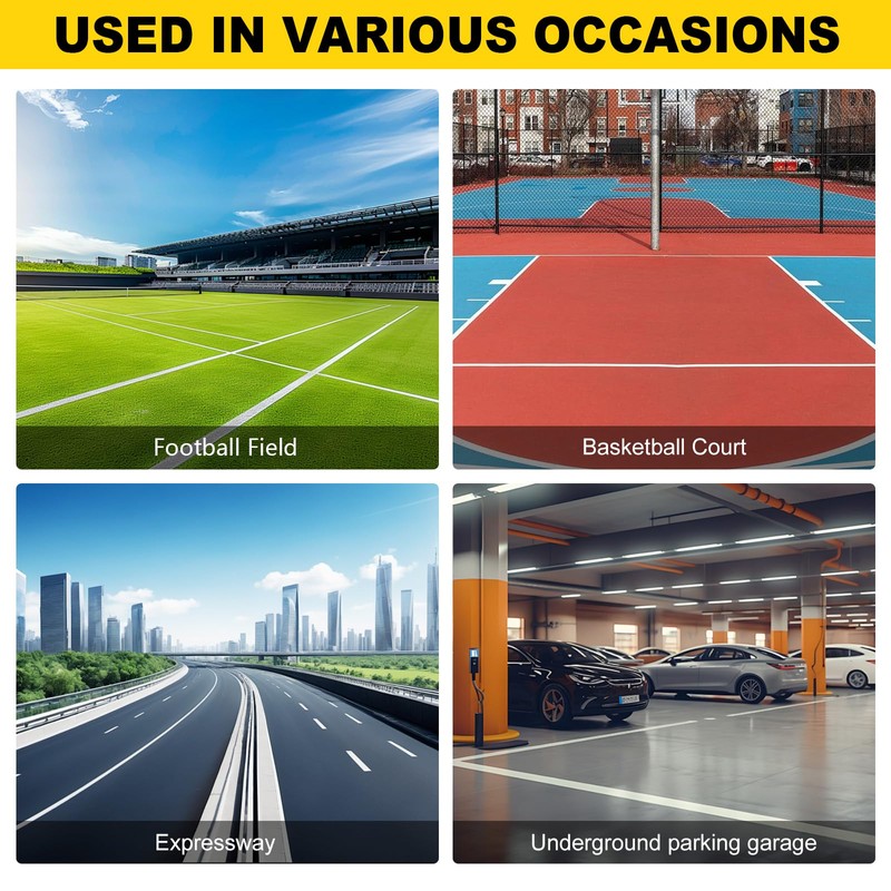 - 【Widely used】: Ideal for marking playing fields and other facilities such as sports courts, basketball courts, tennis courts, volleyball courts, badminton courts, mall area boundaries, caution lines, parking spaces, airport runways, playgrounds, communities, asphalt, concrete, epoxy floors, and more