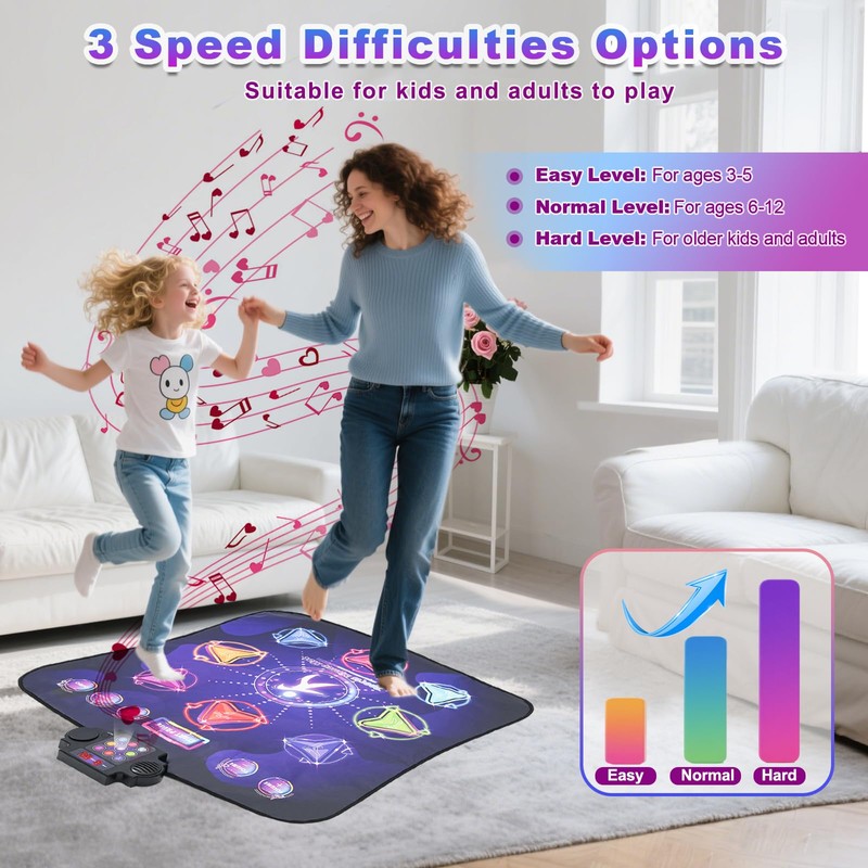 • ✅【Customizable Playing Experience】: Difficulty levels (beginner to expert) and volume control can be adjusted via intuitive buttons on the dance carpet. The game system is perfect for different ages and playing styles. Night exercises possible without disturbing others.