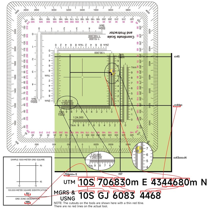 - Larger 1:50,000 and 1:100,000 scale rulers for maps with wider grid spacing.