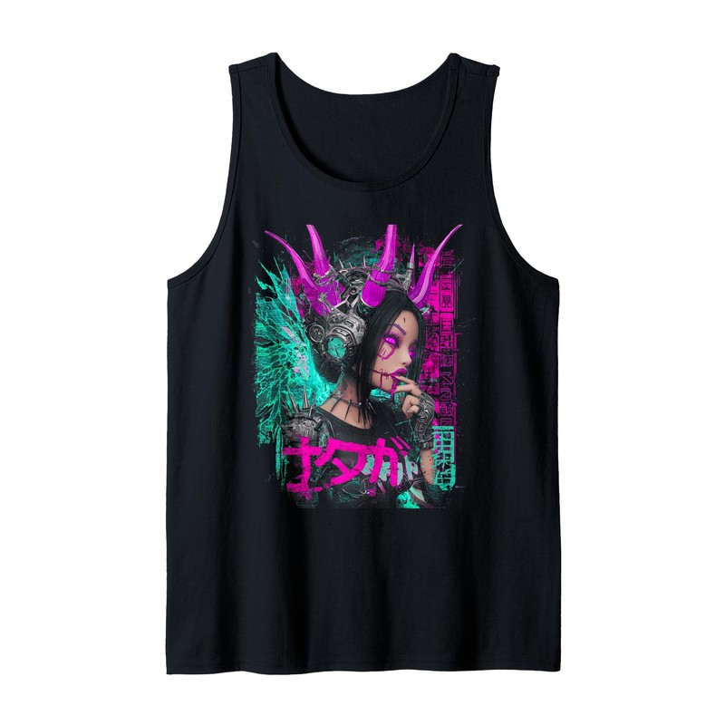 - This bold cyberpunk design features a futuristic girl with tech horns glowing eyes and glitch effects blending anime manga and vaporwave aesthetic into one.