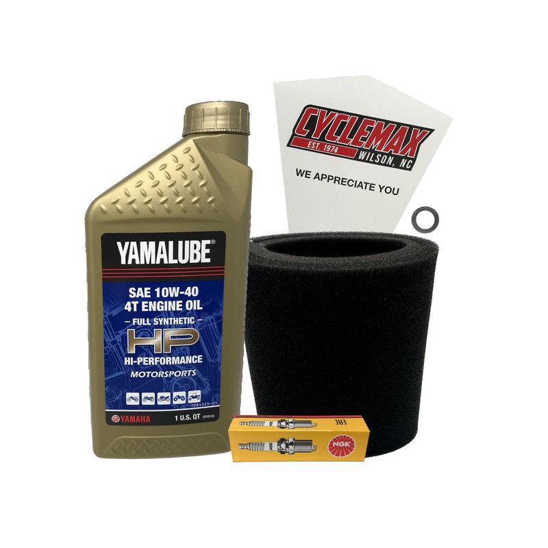 - CYCLEMAX OIL CHANGE KIT INCLUDES: One Yamaha LUB-10W40-FS-12 Yamalube Full Synthetic 10W40 Quart of Oil, One Yamaha 55X-14451-00-00 Air Filter, One CR7HS NGK Spark Plug, One 12mm Drain Plug Crush Washer and a Convenient Disposable Funnel.