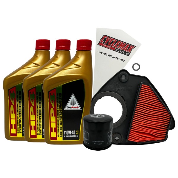 - CYCLEMAX OIL CHANGE KIT INCLUDES: Three Honda 08C35-A14W0M HP4 10W40 Quarts of Oil, One Honda 15410-MFJ-D02 Oil Filter, One Honda 17205-MZ8-G20 Air Filter, One 14mm Drain Plug Crush Washer and a Convenient Disposable Funnel.
