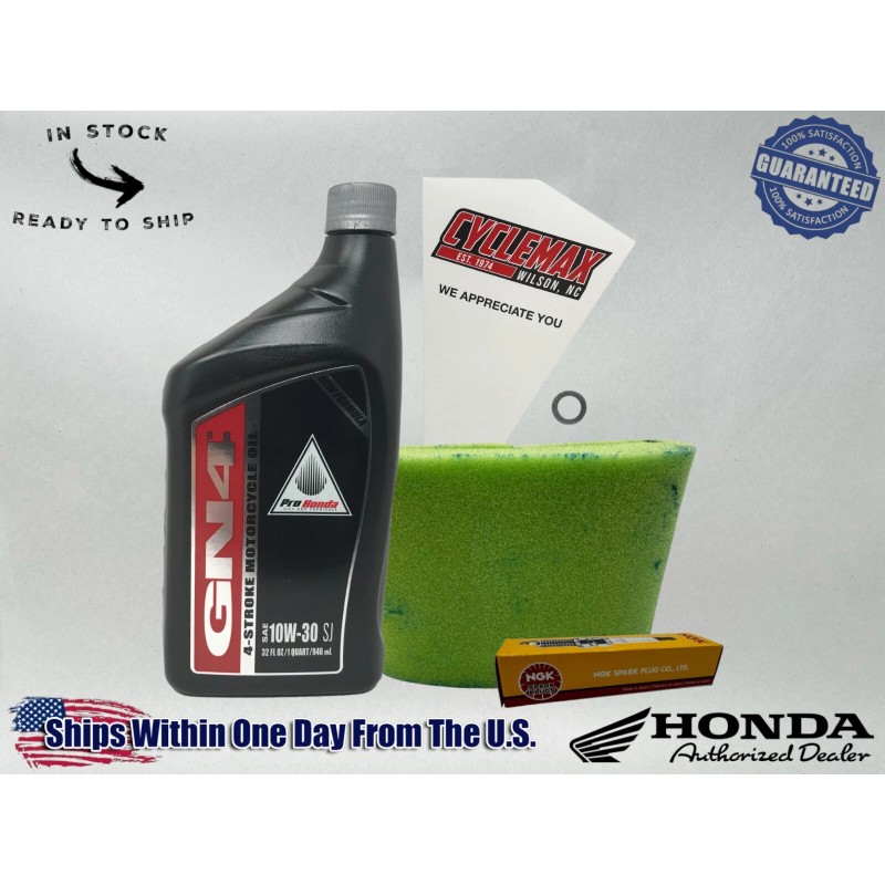 - CYCLEMAX OIL CHANGE KIT INCLUDES: One Honda 08C35-A131M02 GN4 10W30 Quarts of Oil, One Honda 17254-HF7-000 Air Filter, One CR6HSA NGK Spark Plug, One 12mm Drain Plug Crush Washer and a Convenient Disposable Funnel.