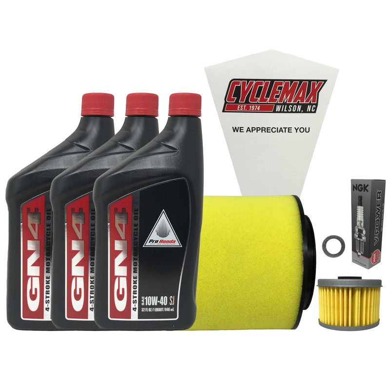 - CYCLEMAX OIL CHANGE KIT INCLUDES: Three Honda 08C35-A141M01 GN4 10W40 Quarts of Oil, One Honda 15412-HM5-A10 Oil Filter, One Honda 17254-HN1-000 Air Filter, One NGK BKR5E-11 Spark Plug, One 12mm Drain Plug Crush Washer and a Convenient Disposable Funnel.