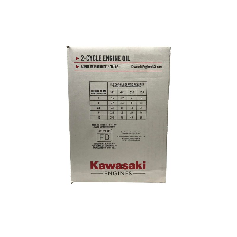 - COMPATIBILITY AND CONVENIENCE: 50:1 mix with 1 gallon of gasoline. Synthetic Blend with fuel stabilizers. Low smoke. For use in all engines where API and JASO FD oil is recommended, Kawasaki 2-cycle engine oil is a synthetic blend that meets and exceeds the rigorous requirements of API TC, JASO FD and ISO EGD classifications for 2-cycle air-cooled small engine applications.