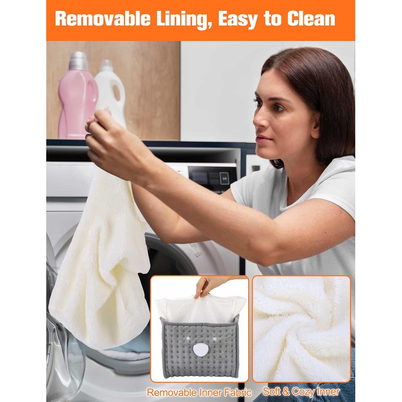 - WASHABLE & REMOVABLE LINER - The feet warmer is made of premium plush liner and fabric. It is snuggly, cozy, comfy, and easy to slip on and off. The inner liner is removed via a button clasp and can be machine-washed and hand-washed. Perfect for warming cold feet & ankles on those chilly nights. It is also sturdy enough that it stays in shape when your feet out. This under desk foot heater is great in a chair or recliner legs down or up.