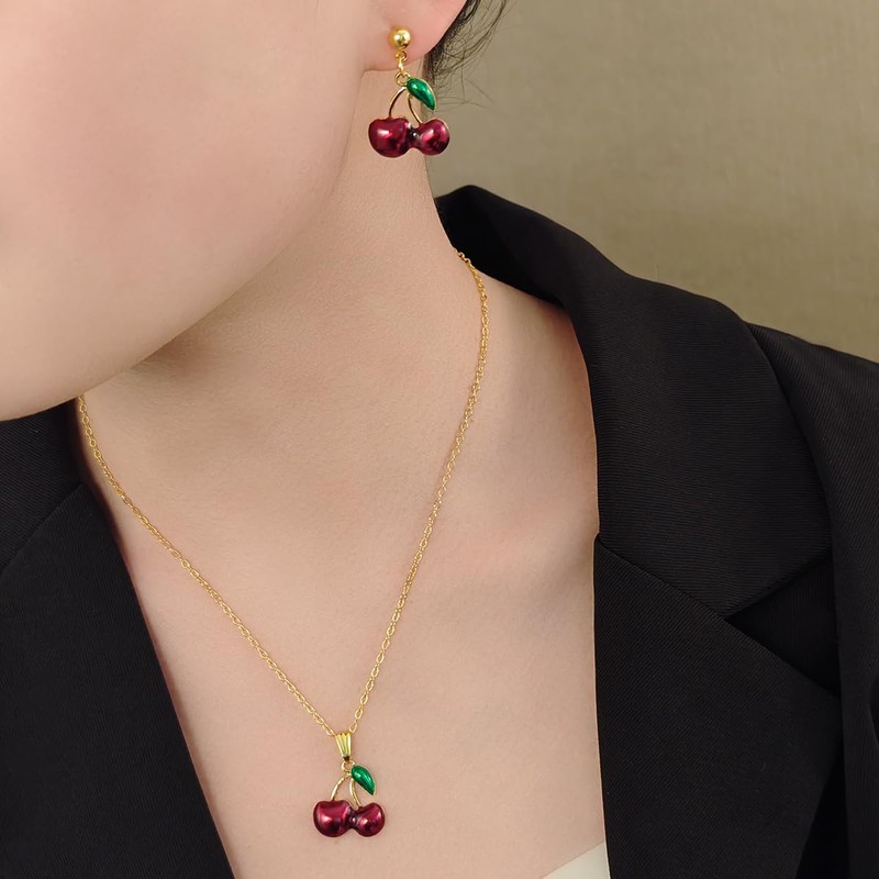 - DESIGN ELEMENTS: Charming cherry-themed jewelry set featuring red enamel cherries with green leaves, perfect for a sweet summer statement look