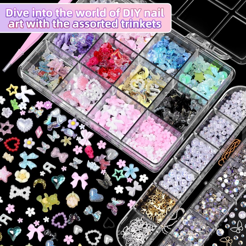 - What You Get: boxes nail art accesorries with tweezers. box round flatback glass rhinestones and pearl nail charms. box acrylic color blossom flower bowknots star moon nail art charms.