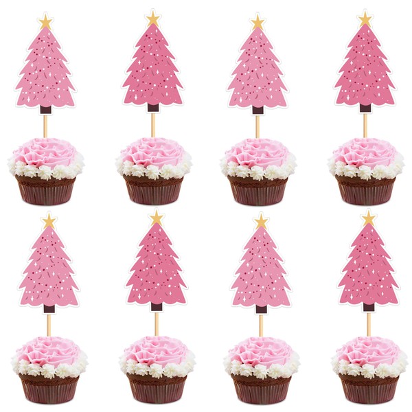 Cyodoos 24PCS Christmas Tree Cupcake Toppers Picks Xmas Holiday Cupcake Picks Merry Christmas Theme Holiday Boy Girl Birthday Baby Shower Party Supplies Pink