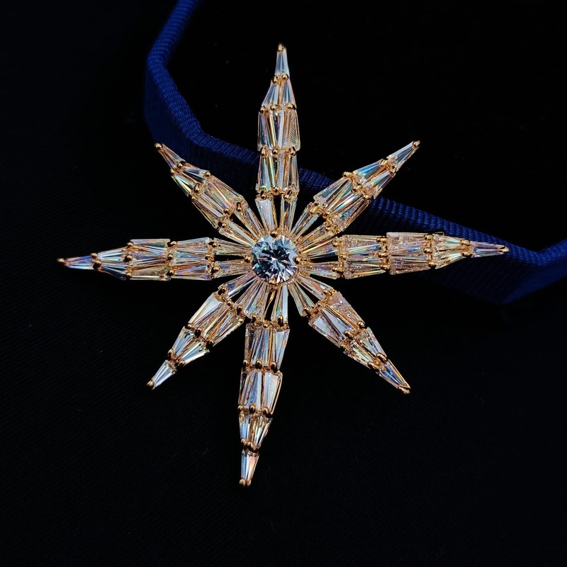 - This captivating hexagram star brooch, elegantly crafted in a gleaming gold-tone plating, showcases a stunning design featuring baguette-cut clear cubic zirconia stones in a pointed, six-pointed, and irregularly bursting pattern. Perfect for those with a passion for atomic-inspired jewelry or those seeking to add a touch of spirituality to their collection, this unique star pin is a must-have for any jewelry box or special star-themed collection.