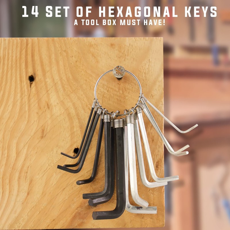 - 🔧🔨🔩👷 HEX KEY 14 PIECE SET ON A CONVENIENT KEY RING - These sturdy precisely machined hexagonal keys are a very hand addition to any tool kit. A perfect addition to any tool box. These Allen keys will make the loosening and tightening hex nuts, bolts and screws much easier and they can reach deep into tight, small, or hard to reach spots