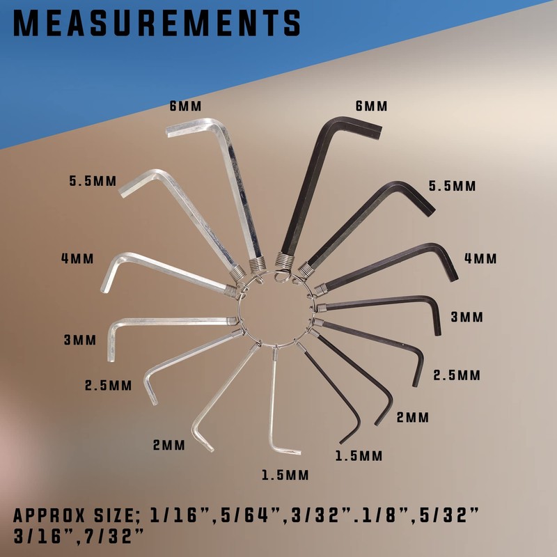 - 🔧🔨🔩👷 SPECS AND MEASUREMENTS OF THE HEX KEYS - there are 14 keys included in the ring with measurements as follows: 1.5mm, 2mm, 3mm, 4mm, 5mm, 5.5mm, 6mm. 1/16”,5/64”,3/32”,⅛”,5/32”,3/16” & 7/32”