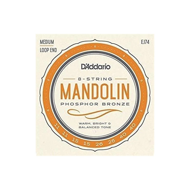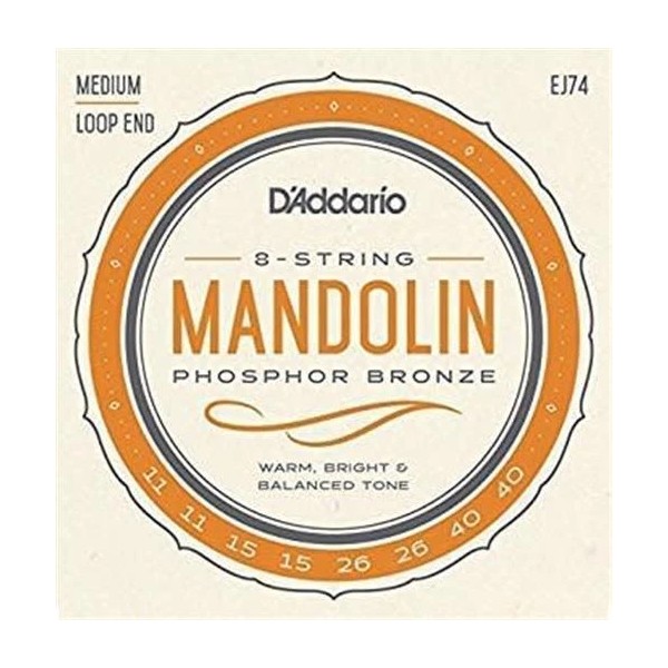 EJ74, D'Addario's best selling mandolin set, is the standard established by David Grisman and Ricky Skaggs. Warm and bright phosphor bronze tone with the optimal blend of tight playing tension and strong projection. Loopend construction for universal fit.