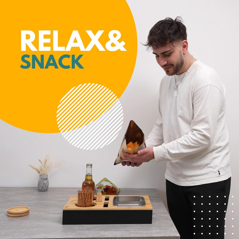 - Versatile Sofa Organizer: Keep drinks, snacks, and remotes within easy reach while relaxing on your sofa. Our couch buddy features dual cup holders designed to accommodate bottles, glasses, and more. The extra-large snack bowl with handy divider makes it the perfect snack dish for cozy evenings.