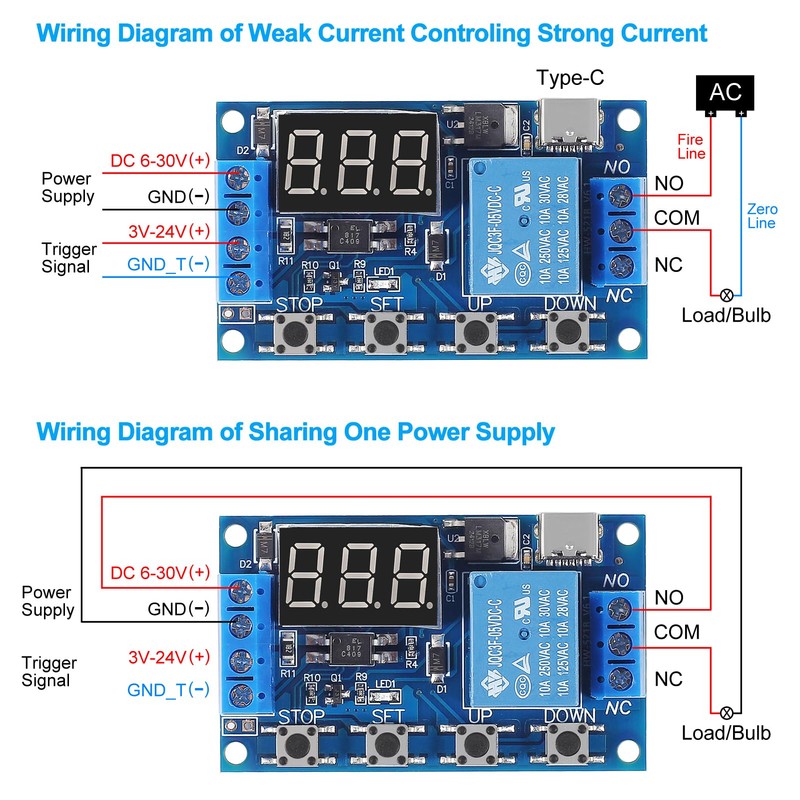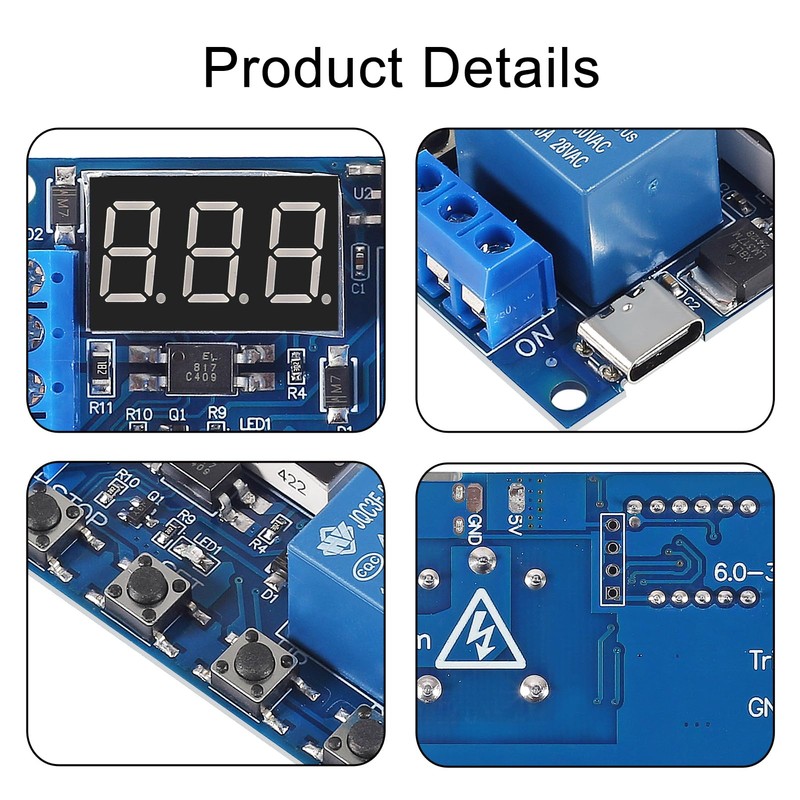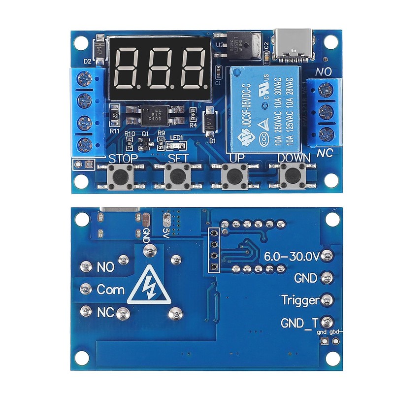 • Operating voltage: DC 6V - 30V, support micro USB 5V power supply. High level trigger: 3V - 24V. NO(Normally open) maximum load < AC 250V/10A, < DC 30V/10A. Timing range: 0.1s ~ 999mins (continuously adjustable).
