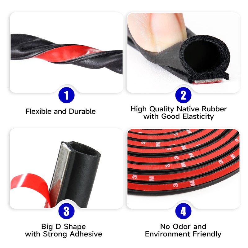 - 【LARGE SIZE QUALITY RUBBER】 The durable D shape rubber seal made of high density EPDM rubber with self-adhesive tape backing and will not freeze or crack under extreme temperature. Strong,flexible and large enough for most applications. 3/4” x 3/4” (W x H) size, durable and reliable.