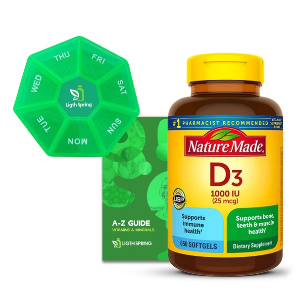 D3 1000 IU Softgels, 650 Count, Supports Bone, Teeth and Muscle Health withwith Bundle Exclusive Vitamins & Minerals - A to Z - Better Ligth&Spring Guide + Weekly Pill Organizer (3 Items)