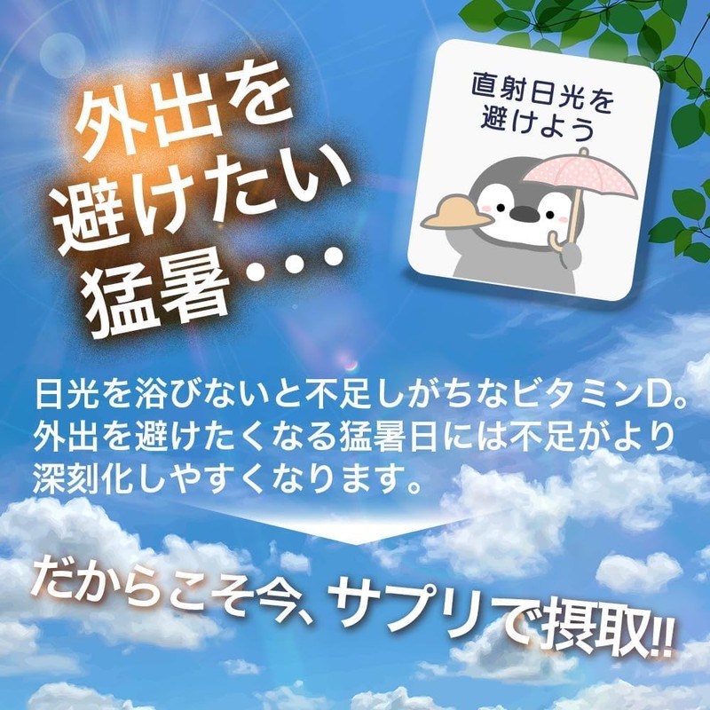- ☀️【高濃度ビタミンD3】紫外線を浴びることが少ない方に不足しがちなビタミンDをお手軽に摂取ができるサプリメントです。1粒に2400IUを高濃度配合で「※卵黄約96個分」のビタミンD3を濃縮!(※卵黄1個のビタミンD3含有量25IUで算出)