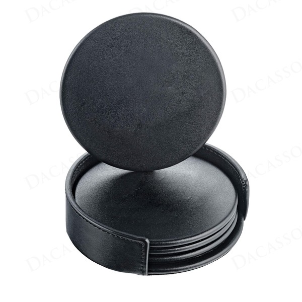 Dacasso Black Leatherette 4 Coaster Set, Round w/Holder - Luxury Executive Decor and Office Desk Surface Protector