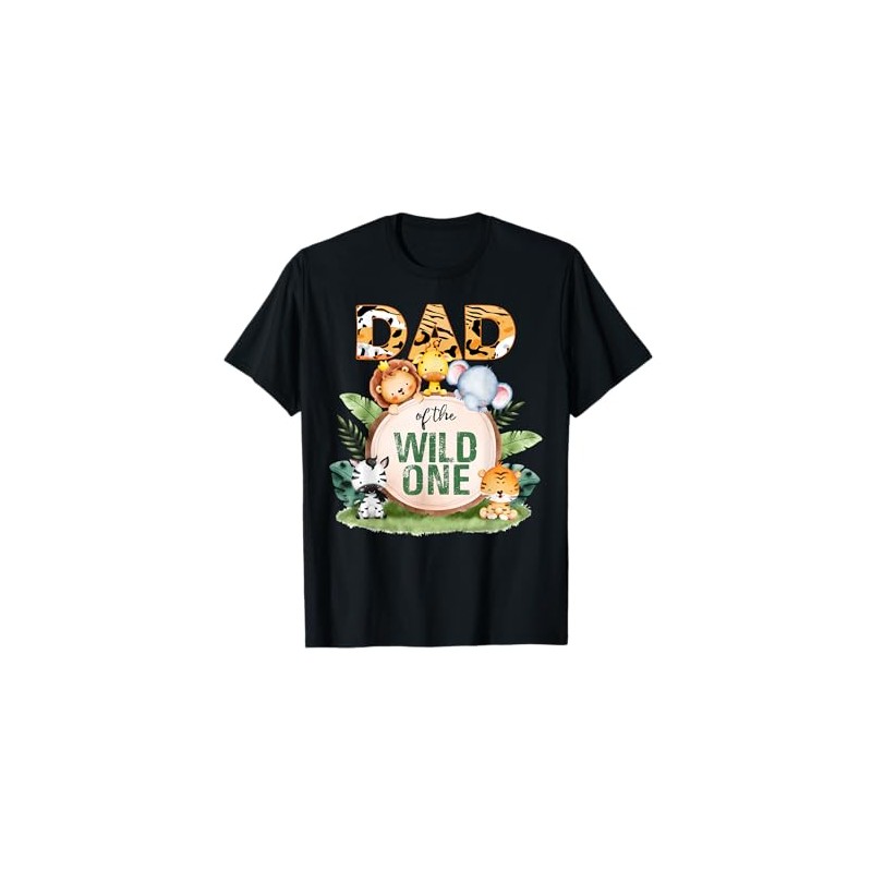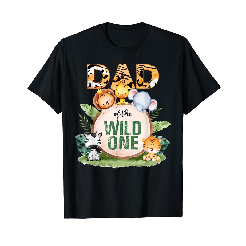 - Dad of the Wild One Zoo Safari Birthday Party T Shirt featuring a the phrase Dad of the Wild One with a Lion, Giraffe, Elephant, zebra and Elephants, Crocodiles, leopard. Check out our brand for more kids and toddlers Zoo themed birthday party