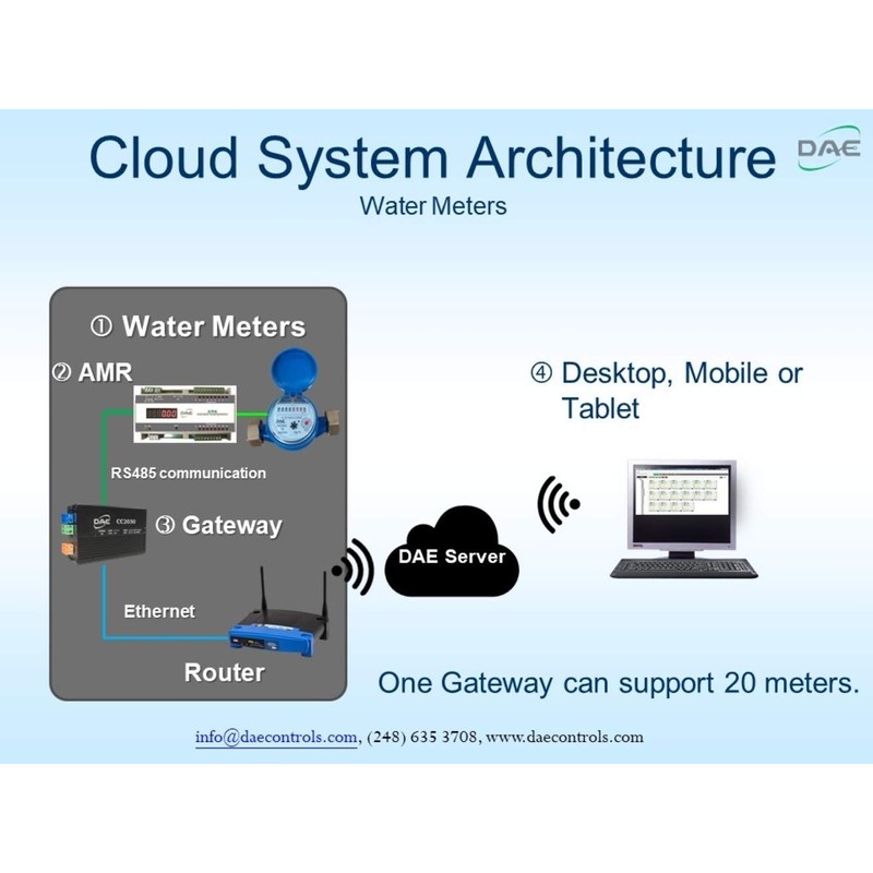 - Cloud Metering available (2nd picture) with DAE CC2030 Gateway. CC2030 will collect water usage from DAE AMR (for 16 meters) or AMR130AN (for 1 meter) and send them to cloud server through Ethernet. With PC, cell phone, the landlords can see real time data, monthly water usage & billing reports to their tenants. If there is abnormal usage (ex. Broken piping), an email alert will be sent to your cell phone. No IT guy required. Just connect wires as per a simple picture (see video) & ready to go.