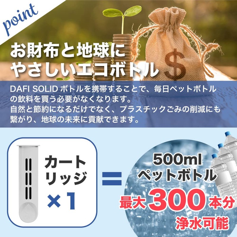 - 【Wallet and Earth Friendly Eco Bottle】1 cartridge can purify water for 300 bottles of 16.9 fl oz (500 ml) bottles. By carrying your DAFI SOLID bottle, you will be able to drink your tap water, so you don't have to buy mineral water every day. Not only does it save you money by nature, it also helps reduce plastic waste and contributes to the future of the Earth