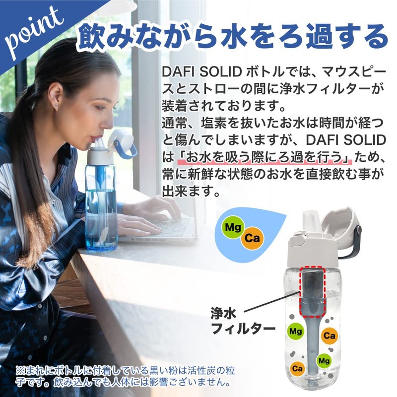 - [DAFI SOLID] Simply pour tap water into the water purifier bottle and the filter removes impurities in the water. The JIS S3201 (home water filter test method) achieves a reduction of residual chlorine residual by over 80%. It leaves beneficial ingredients such as minerals and calcium, while reducing residual chlorine (source of calcium), so you can enjoy delicious water with ease and peace of mind. Normally un-chlorinated water will be damaged over time, but DAFI SOLID is "filtration when absorbing water" so you can always drink fresh water directly