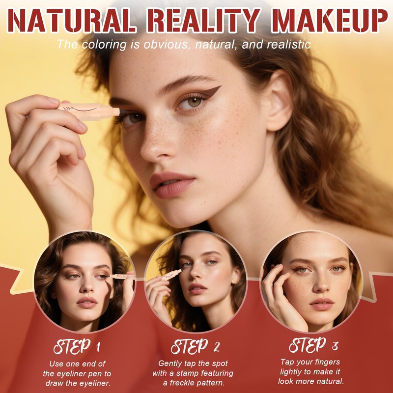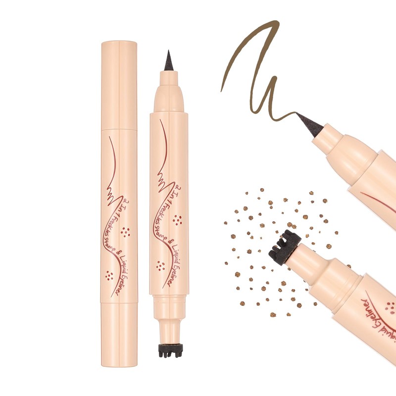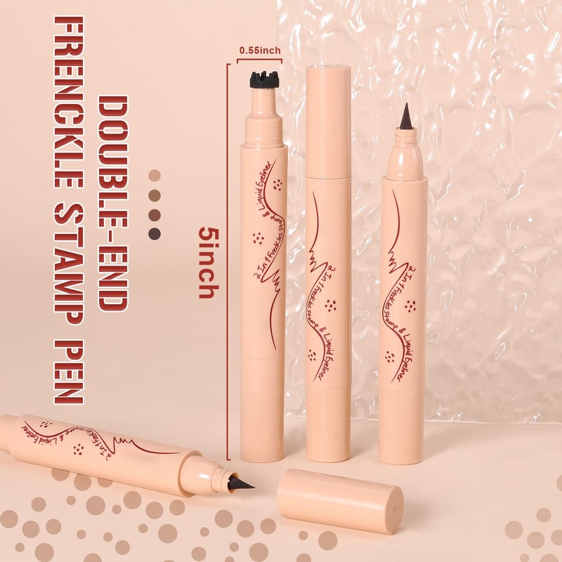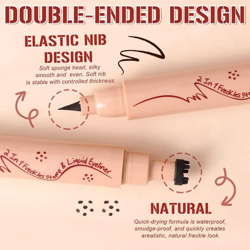 • 2 IN 1 EYELINER AND FRECKLE PEN:This unique makeup pen design features a brown eyeliner pen on one end and a freckle stamp on the other. The dual-ended design streamlines makeup tools by completing the freckles makeup and waterproof eyeliner makeup in one go.