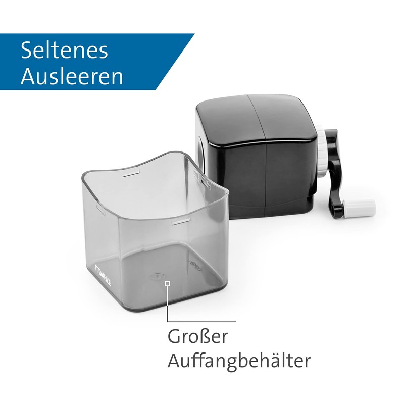 - Handy sharpener with crank and cutter made of high-quality steel for manual sharpening of pencils and crayons for professional results