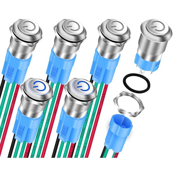 DaierTek 6Pcs Mini Round Waterproof Push Button Switch 12mm ON Off Latching 1NO Pushbutton Self-Locking with Blue LED 12V