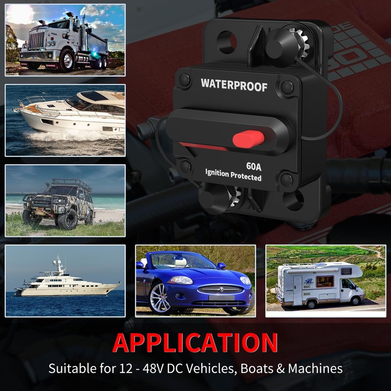 - Application: This 12 volt marine circuit breaker is typically used in automotive, such as truck, bus, RV, caravan, tractor, UTV, ATV, etc. In addition, this car circuit breaker can also be used as 60 amp marine circuit breaker due to its waterproof function, for boat, yacht, etc.